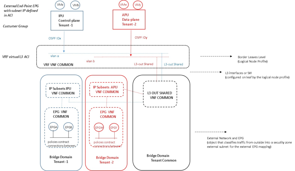 For each Tenant we have two different VRF belonging and will be consider the VRF virtual L3 ACI Fabric and configured on Border Leaves level as logical node profile;