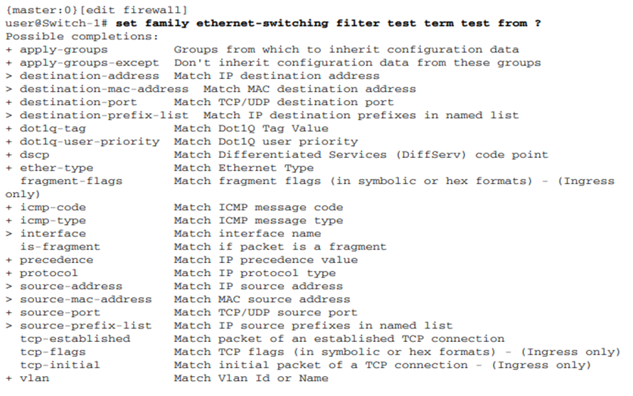 edit family ethernet-switching  # protocol family ethernet switching for firewall filter