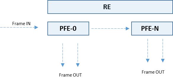 2) Ingress PFE performs a MAC address lookup, determines no entry exists then replicates frame out to other PFE and all other ports in the same broadcast domain (vlan)