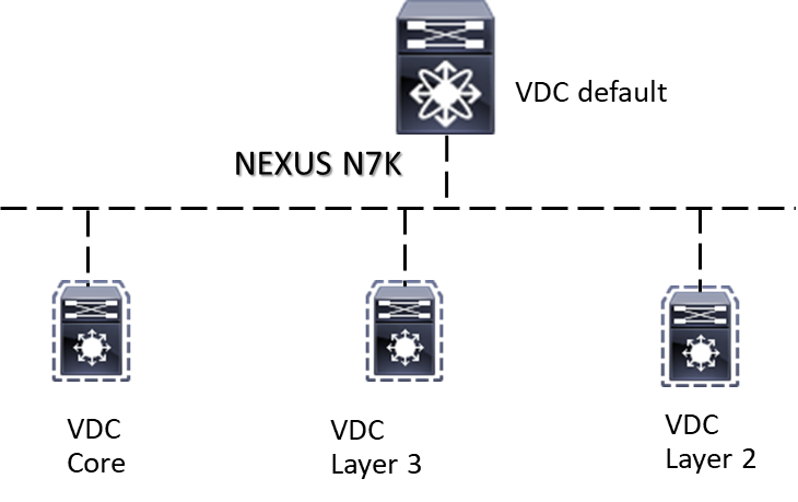 inizialmente tutte le risorse hardware (physical ports) e software appartengno al VDC di default; attraverso questo VDC è possibile creare nuivi contesti virtuali ed allocare le risorse di cui sopra ai VDC di competenza consentento una completa separazione dei protocolli di livello 2 e 3.