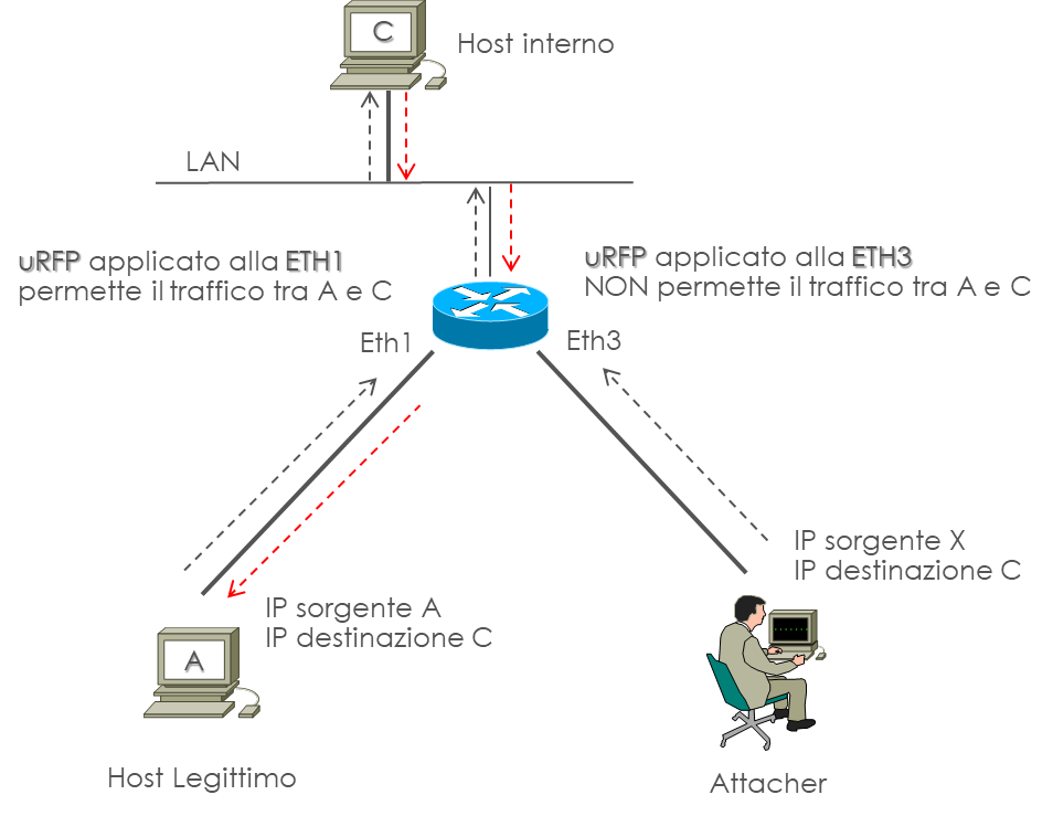 Unicast Reverse Path Forwarding (uRPF) garantisce sicurezza attraverso la verifica dell’indirizzo IP sorgente per traffico transitante attraverso un router, con il drop dei pacchetti se l’indirizzo IP sorgente non è compatibile e verificato con quello legittimo